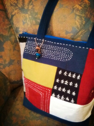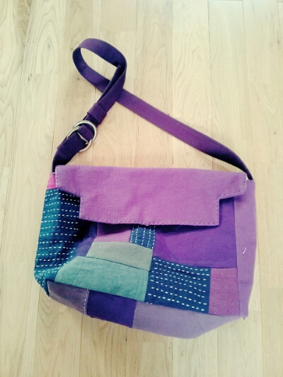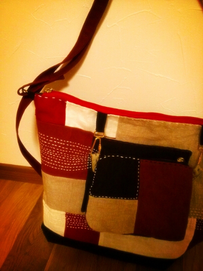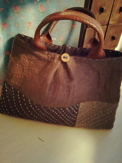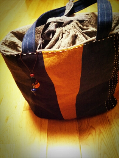 本日の作品は、インディゴとグレーの麻シルクの生地で作ったカジュアルバッグです。