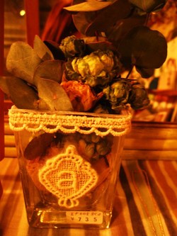 そして本日の新作はガラスの小さな器に、ドライフラワーと珍しくレースを組み合わせてみました。